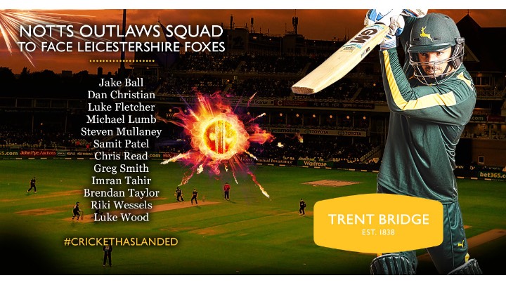 Leicestershire Foxes squad to face Notts Outlaws (from): Mark Pettini (capt), Mark Cosgrove, Cameron Delport, Farhaan Behardien, Lewis Hill, Paul Horton, Niall O’Brien (w/k), Kevin O’Brien, Neil Dexter, Clint McKay, Ben Raine, Rob Sayer, Richard Jones, Dieter Klein