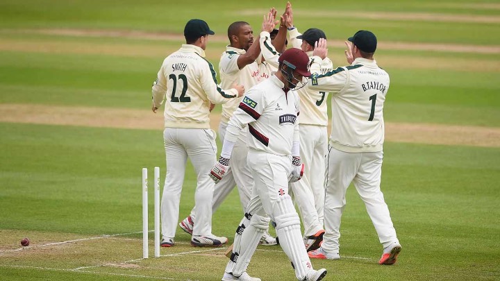 Samit Patel made 56 and James Taylor scored 45, having had a reprieve on 38. Given out to a leg side catch he was recalled when ‘keeper Alex Barrow confirmed he hadn’t taken it cleanly.