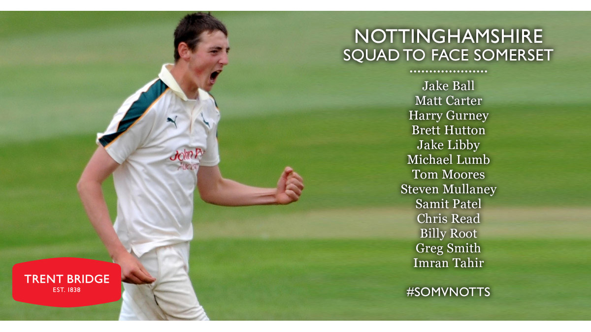 Nottinghamshire squad to face Somerset (from): Jake Ball, Matthew Carter, Harry Gurney, Brett Hutton, Jake Libby, Michael Lumb, Tom Moores, Steven Mullaney, Samit Patel, Chris Read (captain), Billy Root, Greg Smith and Imran Tahir.