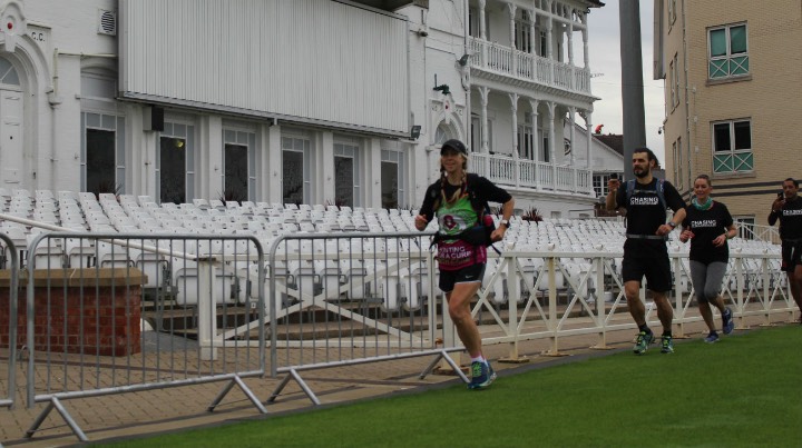 A charity fundraiser hoping to break the world record for consecutive daily marathons today (Thursday) stopped by at Trent Bridge on her way to successfully completing her 61st run over the distance.
