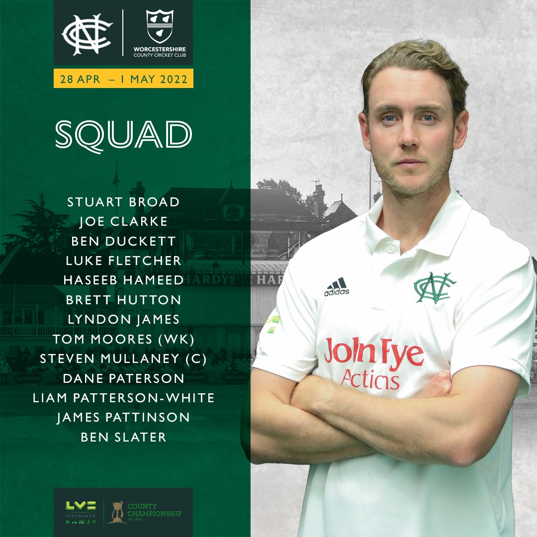 Nottinghamshire’s squad to face Worcestershire (from): Ben Slater, Haseeb Hameed, Ben Duckett, Joe Clarke, Lyndon James, Steven Mullaney (captain), Tom Moores, Liam Patterson-White, James Pattinson, Brett Hutton, Stuart Broad, Luke Fletcher and Dane Paterson.