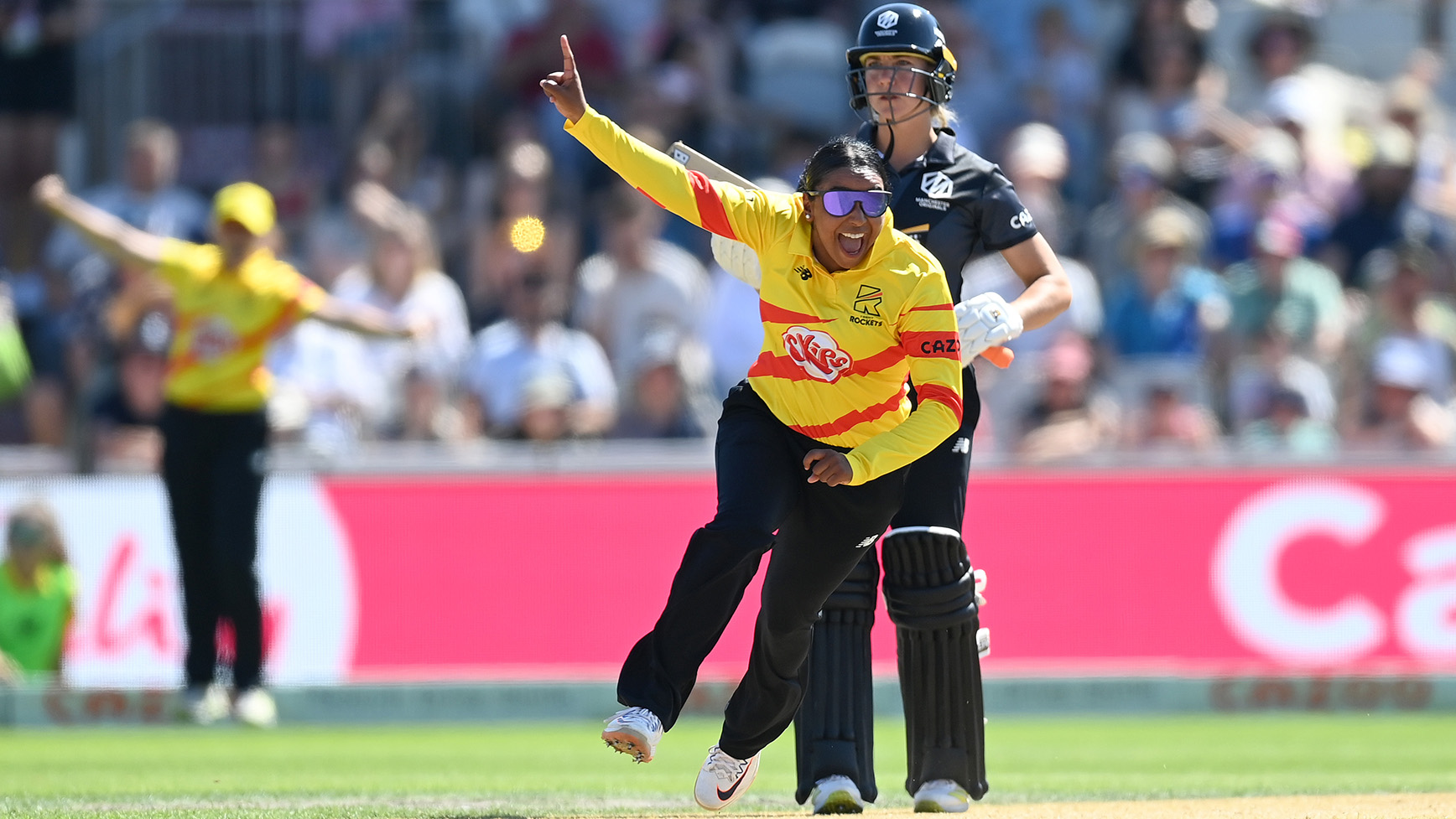 But it was King’s historic hat-trick that the sizeable Mancunian crowd will remember. Cordelia Griffith was bowled for 12, before Sophie Ecclestone was trapped LBW first ball.