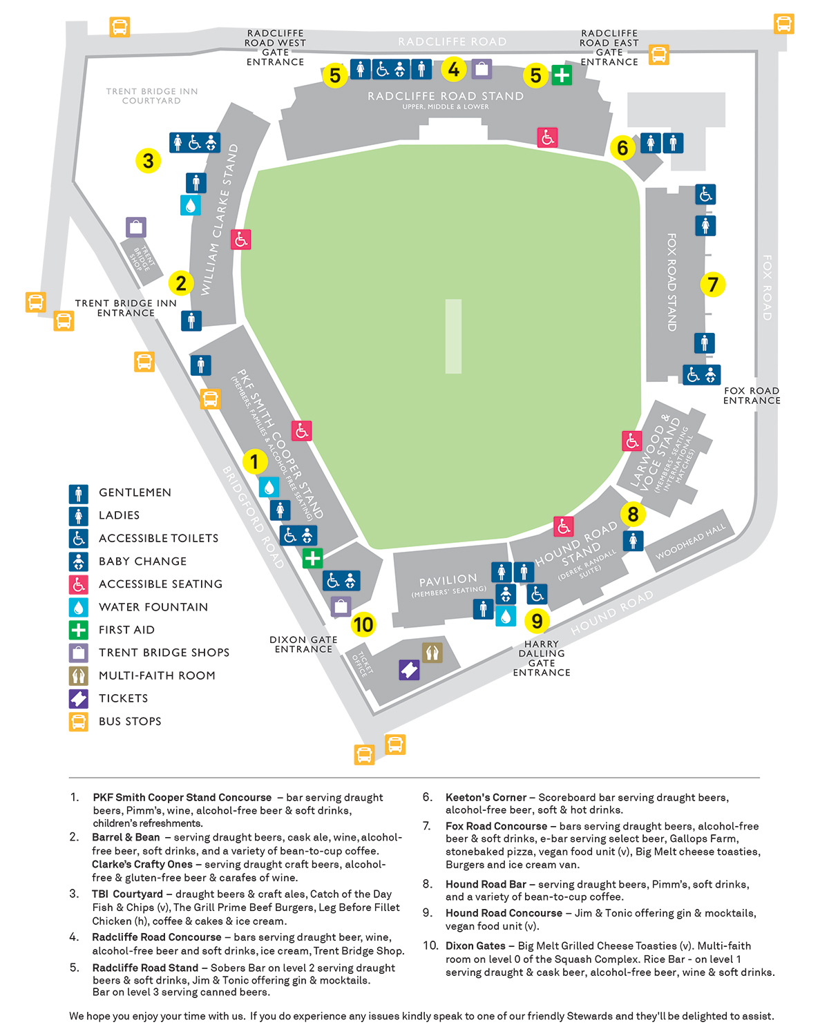 We have gates through which to enter the ground situated on Bridgford Road, Radcliffe Road, Hound Road and Fox Road. Your ticket will indicate which gate you should use.