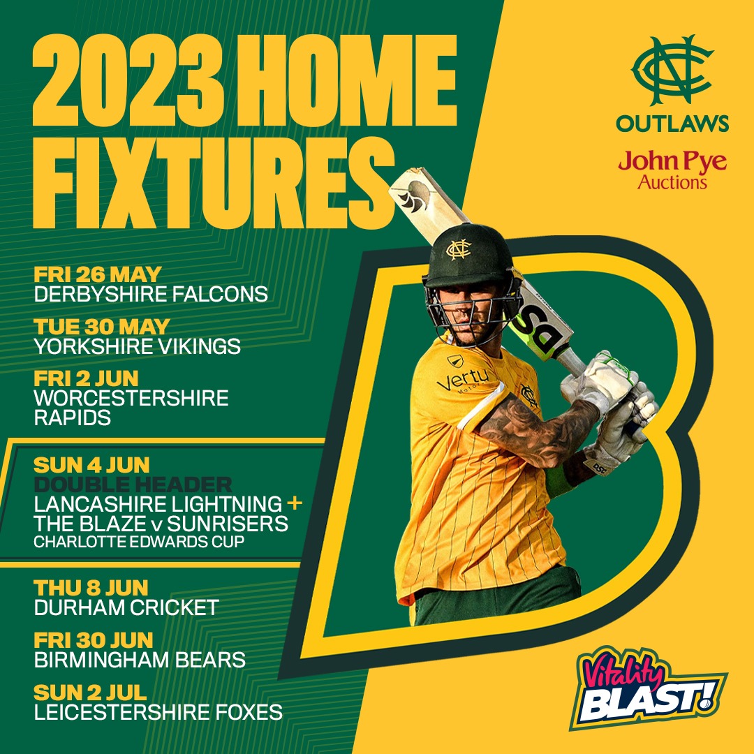 The Outlaws' campaign commences with an East Midlands derby against Derbyshire Falcons on Friday 26 May, which is swiftly followed by the half-term T20 for £10 fixture against Yorkshire Vikings on Tuesday 30 May.