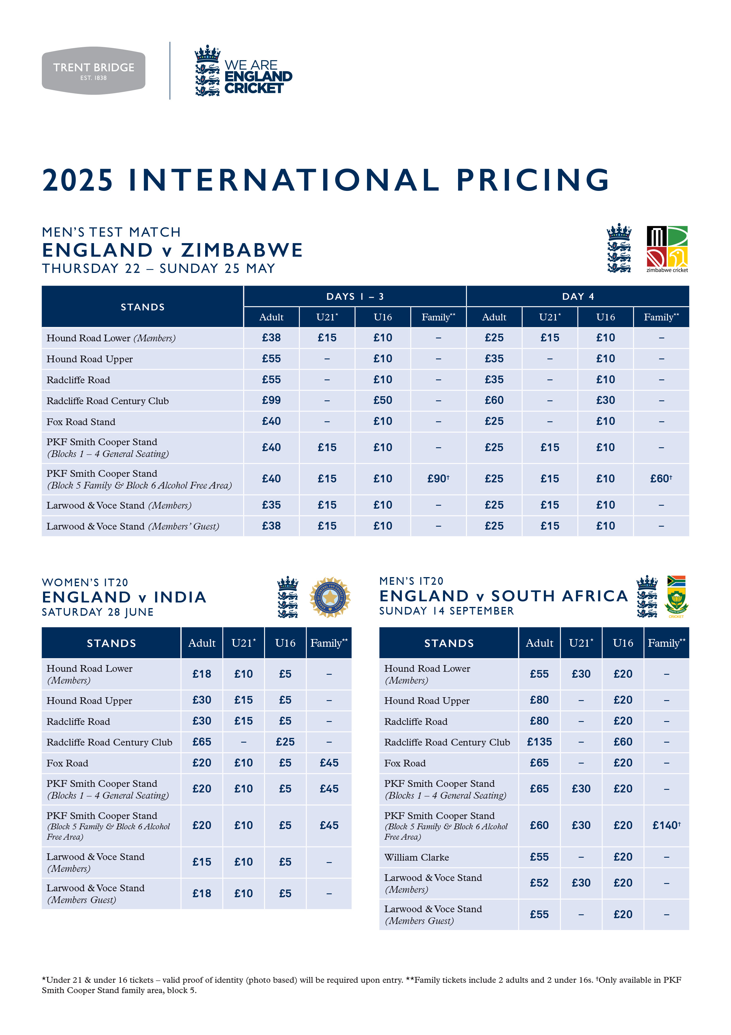 Adult tickets are priced from £25 for England Men's Test against Zimbabwe, with seats available from £15 for England Women's IT20 against India and from £60 for the men's IT20 against South Africa.
