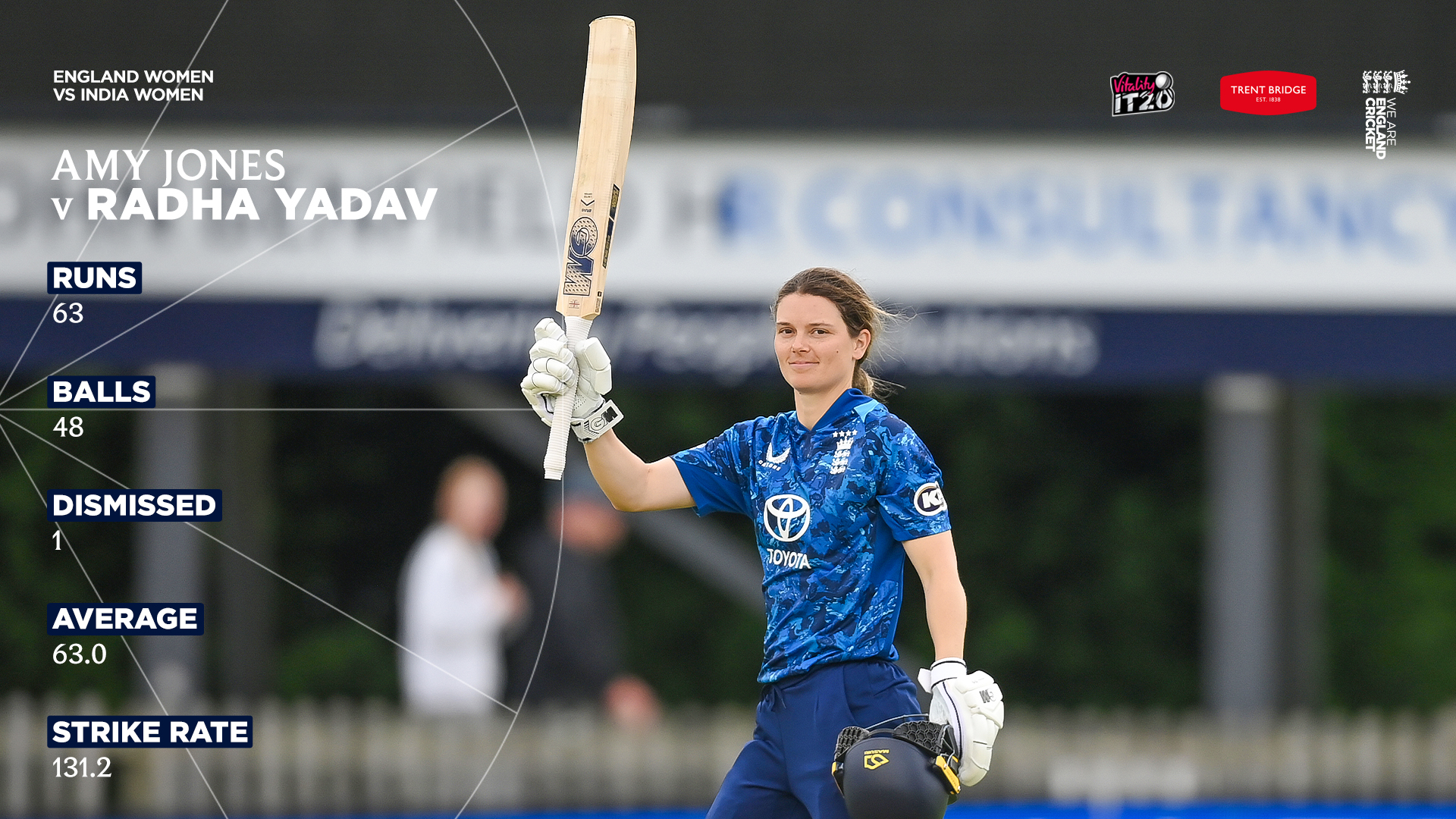 Overall, Jones has now struck 63 runs off 48 balls from Yadav, giving her a strike rate against the bowler of 131.2, and has been dismissed by her only once, bowled in a 2022 clash in Bristol that England went on to win by seven wickets.