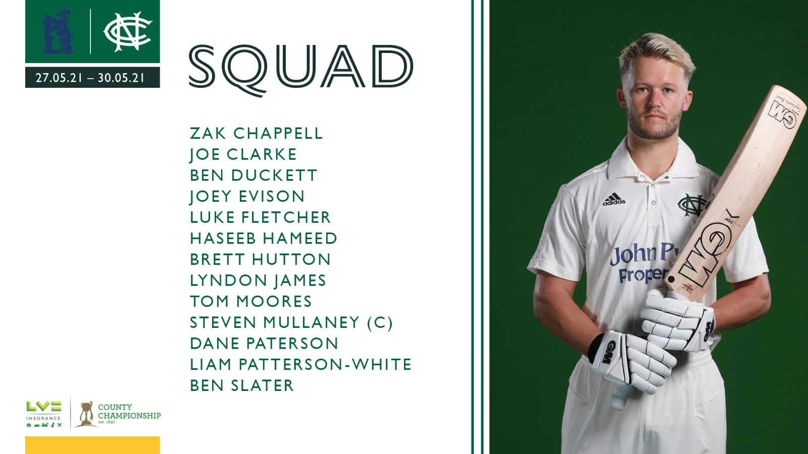 Notts have made one change to their squad from the victory against Worcestershire, with Brett Hutton replacing Stuart Broad who is away on England duty.